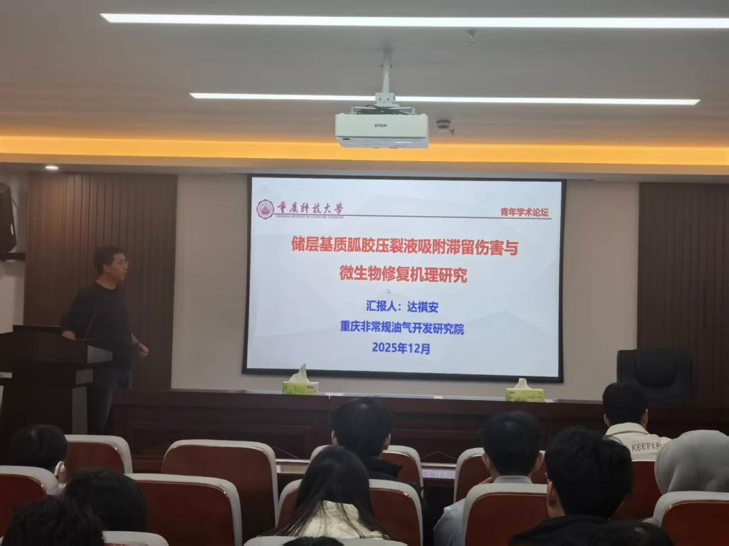 达祺安博士以“储层基质胍胶压裂液吸附滞留伤害与微生物修复机理研究”为题做学术报告。报告以油气储层易受胍胶压裂液伤害这一实际工程难题为切入点,系统阐述了胍胶压裂液在基质中的吸附滞留机理,同时借助微生物学方法,构建了完整的微生物修复菌种体系及应用方法,为非常规油气储层的水力压裂效果提升与低伤害开发提供了重要的理论依据与技术支撑。