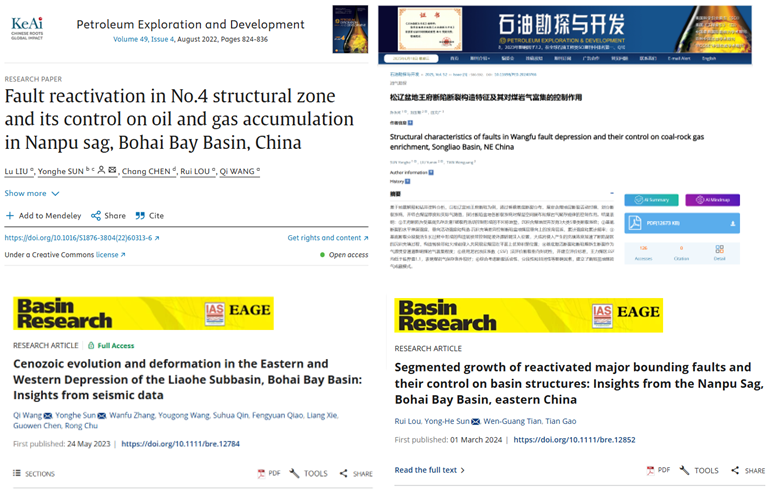 依托国家自然科学基金项目和中国石油“十四五”前瞻性基础重大科技项目,我校石油与天然气工程学院孙永河教授科研团队连续四年在石油地质行业顶级期刊连续发表高质量科技论文4篇,其中,中科院SCI一区Top期刊论文2篇,于2022年和2025年在《Petroleum Exploration and Development》发表,题为“Fault reactivation in No.4 structural zone and its control on oil and gas accumulation in Nanpu sag, Bohai Bay Basin, China”和“Structural characteristics of faults in Wangfu fault depression and their control on coal-rock gas enrichment, Songliao Basin, NE China”;中科院SCI二区期刊论文2篇,于2023年和2024年在《Basin Research》发表,题为“Cenozoic evolution and deformation in the Eastern and Western Depression of the Liaohe Subbasin, Bohai Bay Basin: Insights from seismic data”和“Segmented growth of reactivated major bounding faults and their control on basin structures: Insights from the Nanpu Sag, Bohai Bay Basin, eastern China”。四篇论文均由孙永河教授作为唯一通讯作者牵头或指导在读博士研究生发表,论文详细内容请参阅: