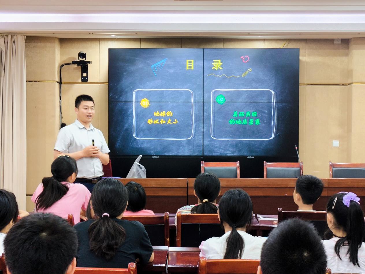 活动紧扣地球奥秘与乡土特色。在第一场“奇妙地球,宜居关坝”讲座中,团队成员化身“地球讲解员”,通过生动的图片、简易模型及互动问答,将抽象的地球圈层结构、宜居的地球资源环境变得触手可及。当知识聚焦于孩子们脚下的土地时,现场气氛尤为热烈——王敦繁博士结合关坝镇周边典型的地质地貌景观以及我校师生实地采集的化石标本,深入浅出地阐释了这片青山绿水的形成密码,让孩子们第一次真正“读懂”了自己生长于斯的家园。